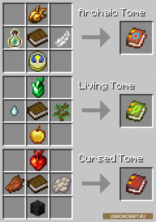 Мод на волшебные книги Tomes позволит вам стать настоящим магом  игру три волшебных книги, которые вы сможете зачаровать на столе зачарований и творить редкие и интересные заклинания. Учтите, что данные заклинания будут работать до тех пор, пока книга находится у вас в руках. Только чары тридцатого уровня могут применять активные заклинания, так что для их получения вам потребуется запастись большим количеством книжных полок.